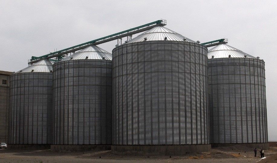 装配钢板仓内还有料位高度的感应设备,而且还有温度/湿度的感应设备,这些设备和电气控制设备进行链接。钢板仓的地步也有通风网管,与高压风机进行对接。保温层沿着仓体的外壁进行铺设,保温层的地步延伸到地面,顶部高出仓体,封顶。